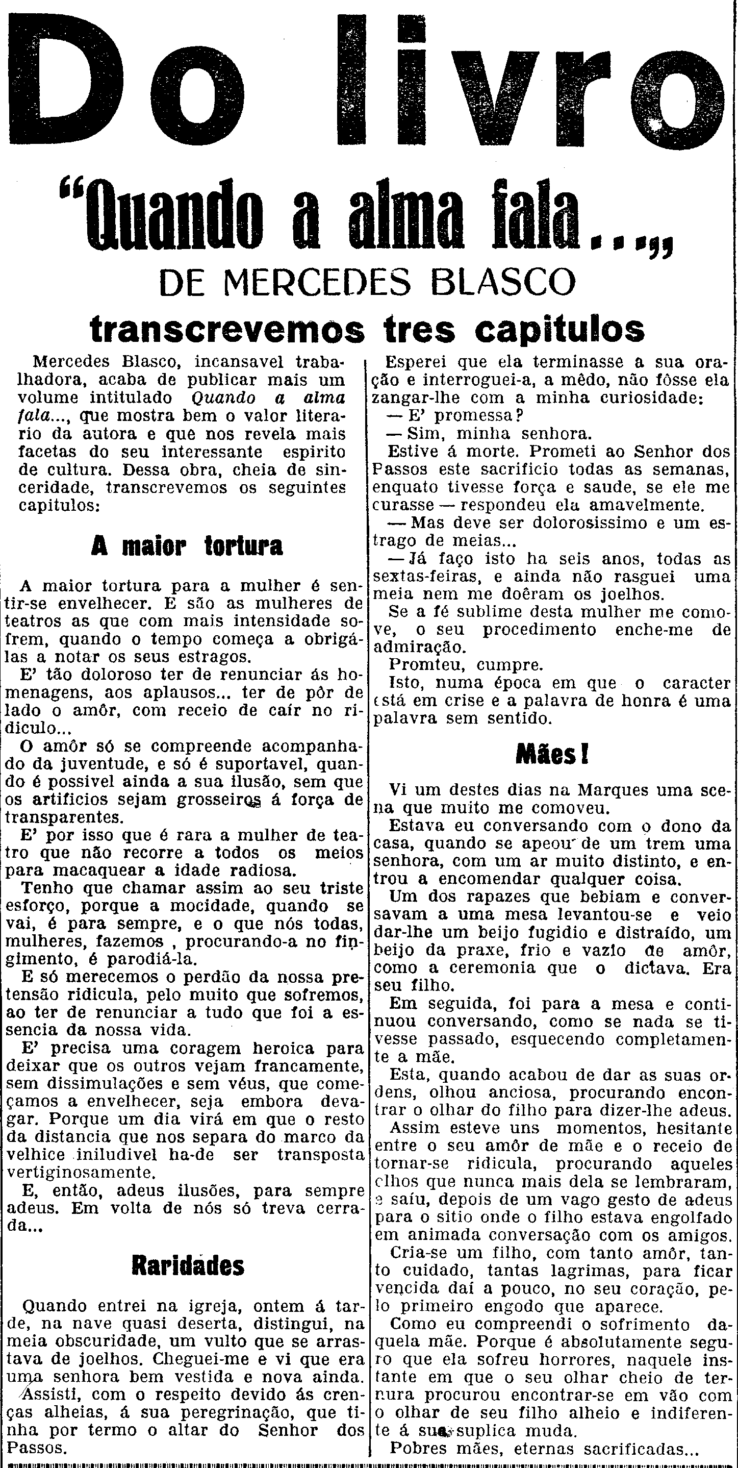 Acontece, porém , que para Yvette Guilbert o destino abriu uma excepção extraordinaria. Conheci-a, sem a conhecer ainda, seguindo de longe, daqui dos nossos teatros, o seu caminho glorioso. E assim me habituei a admirá-la. Mas não é nisto que reside o ponto original das minhas relações espirituais com Yvette, sem nunca a ter visto senão em retrato. Já não saber. Como eu conhecesse vários idiomas, entre êles, muito bem o francês, lembrou-se o eminente, crítico teatral Colares Pereira, falecido Há pouco, de sugerir-me a idéia de imitar a grande cançonetista. Eu só sabia da sua "maneira" especial de detalhar um couplet, pelos seus biógrafos e críticos. Mas êsse pormenor não me assustou. Mandei vir de Paris grande parte do seu reportório e tratei de assimilar o feitio artístico da famosa intérprete da Lanterne.